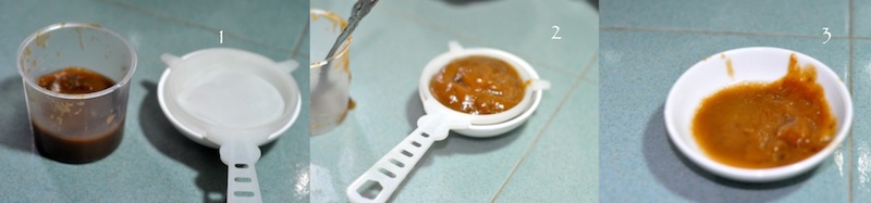 - Soak the tamarind in ¼ cup hot water for 10 minutes. Then use a strainer to strain and squeeze out the liquid from the pulp. Use 1 or 1 ½ Tbsp of this strained, thickened liquid tamarind solution for the recipe.