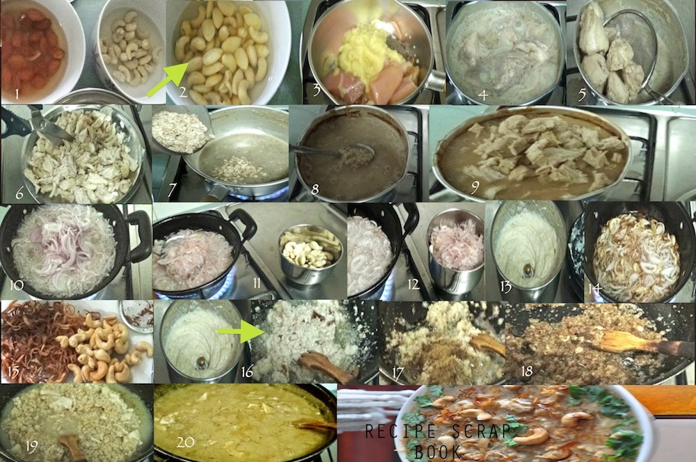 - Finely slice and fry onion,(10) till transparent and remove half (11 &12) and grind along with nuts to a paste.(13).