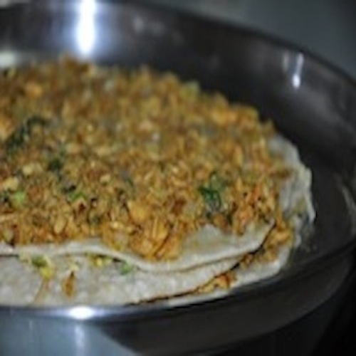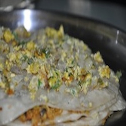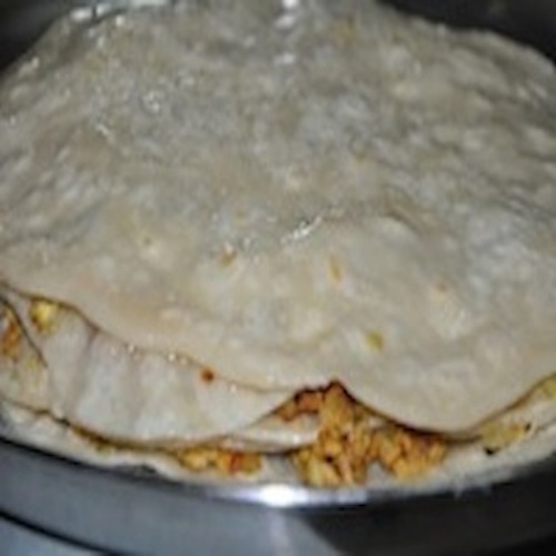- Place another Roti dipped in egg) on top. Spread half of the scrambled egg mixture over this scantily.