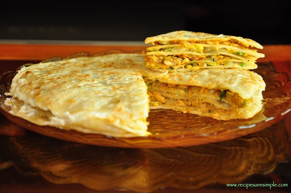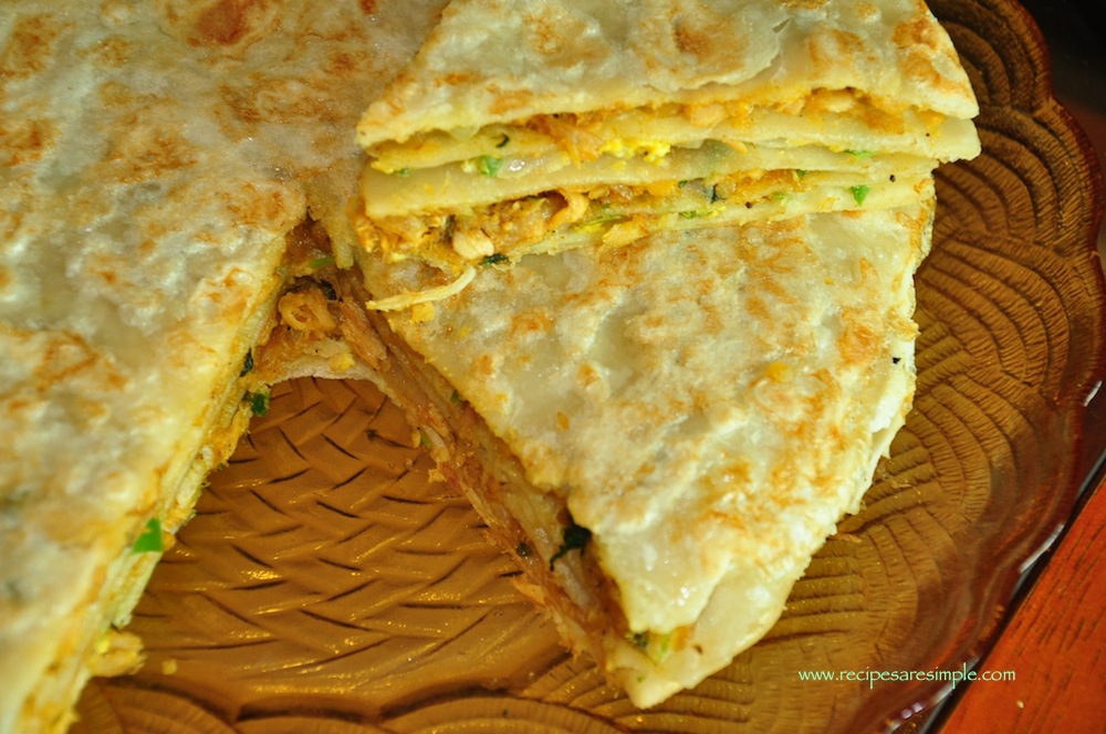 - Continue as follows.Another dipped Roti, Another chicken tuna layer, another dipped roti, another egg layer, and the last dipped roti.