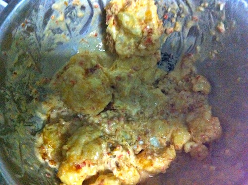 - Add the cauliflower florets and toss with hands till well coated as seen in the picture.