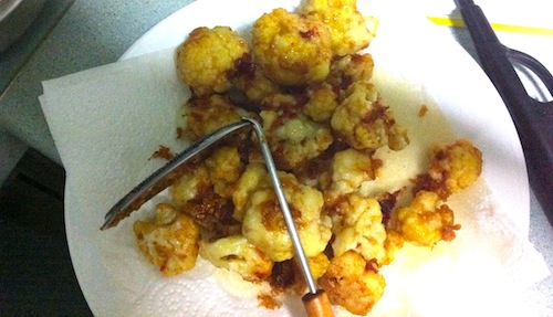 - Once all the florets are fried and drained well, bring the oil back up to a good heat and fry in batches again this time till you get a nice crisped coating and a reddish golden color. ( you should hear a distinct crusty sound when you knock at a fried floret with the back of a spoon) Spread on a fresh tray of paper towels to drain well.