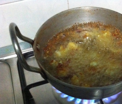 - When you are set to fry, Heat oil in a deep pot. Test if the oil is hot enough by dropping a tiny amount of batter, it should sizzle and come up to the top quite quickly.