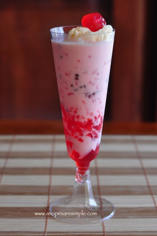 - Pour in the rose milk to almost cover the ‘Jellied strands’. Top with the soaked kiwi seeds. And then finally place a scoop of ice-cream and a maraschino cherry on top!