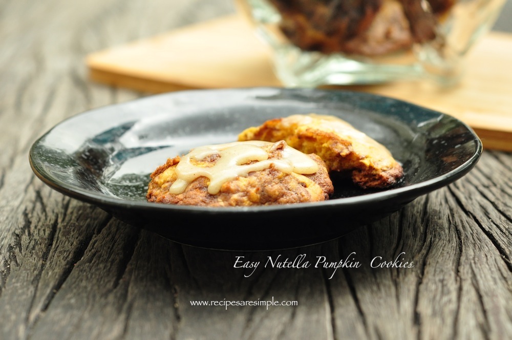 I Love the idea of Pumpkin Puree in cookies, Pumpkin is so naturally sweet when baked to a puree that it creates a blissful batter. Add some ‘Nutella’ and – are you kidding me? The cookies are soft and chewy and they are so quick to make. This is adapted from the Betty Crocker Recipe. I made some Browned Butter Frosting to drizzle on top but it isn’t essential.