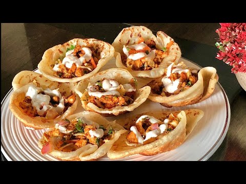 A fun tasty Party snack, featuring shawarma meat and sauce in a fresh fried small tortilla bowl, easy for guests to grab and enjoy.