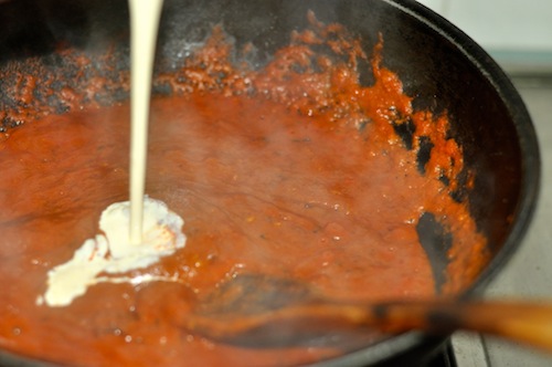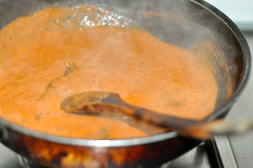 Blanched Tomatoes Pureed Paneer thawed or fresh Oil and Butter Whole spices added Ginger-Garlic paste added Sautéed till raw smell is gone. Spice powders added Stir till cooked without burning Fresh &Canned Tomato puree added cooked down till thickened Season with salt and sugar* Cream added Stirred through Paneer added Simmer a bit and rest Garnished with drizzling of cream and coriander