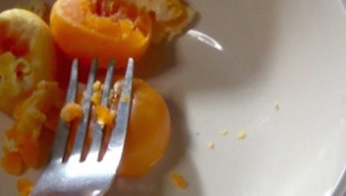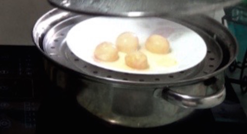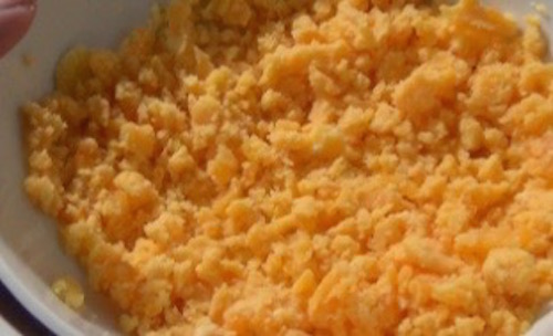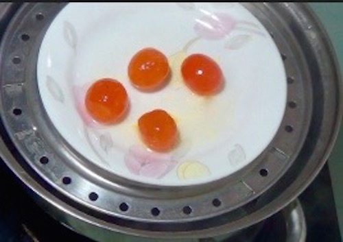 - Separate the ‘salted’ egg yolk from the whites. (We only need the yolk). To remove the charcoal paste from the salted eggs (if present), simply scrape gently and place under running tap water. (Be gently – remember – its a raw egg shell under there).