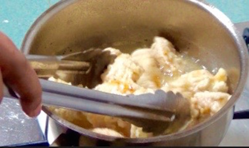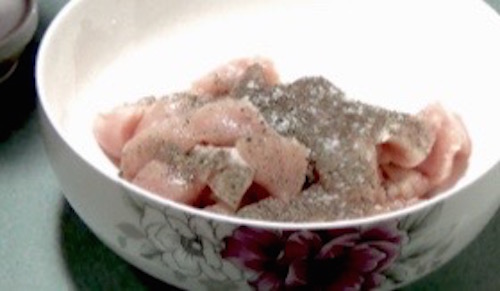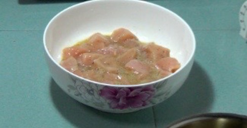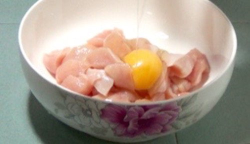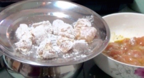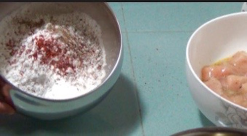 Add fresh egg to bite size pieces. Season with salt(or salted egg-white) and pepper. Mix well. Tapioca flour, sweet potato flour, salt, pepper and chilli flakes to taste. Coat the chicken pieces in dry mix. Fry in small batches.
