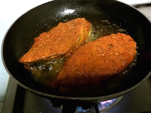 Tandoori Fish Fry is a delicious way to use Tandoori Marinade. Seafood lovers will love this coastal recipe. It uses the Tandoori marinade in a slightly different method adding some additional coating and instead of being grilled in a tandoor or oven, this Fish is pan-fried on one side prior to being broiled under a grill to cook it to flaky perfection! Watch the video!