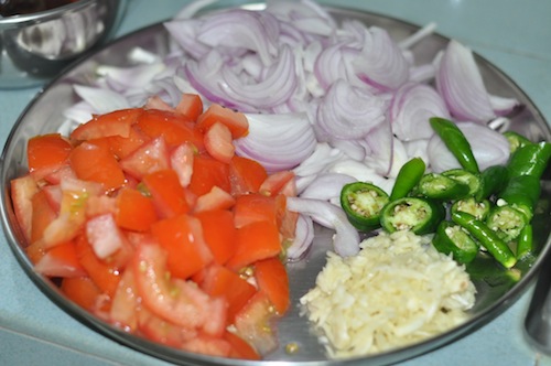 - Slice the onions finely, cut the chillies as desired, chop the tomatoe, crush the garlic and prepare the ginger by finely dicing first and then gently crushing.