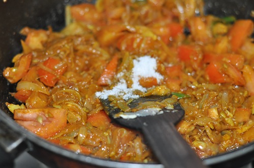 - Add salt to taste (about 1 tsp) and stir continuously till the tomatoes are cooked and well incorporated into the masala.