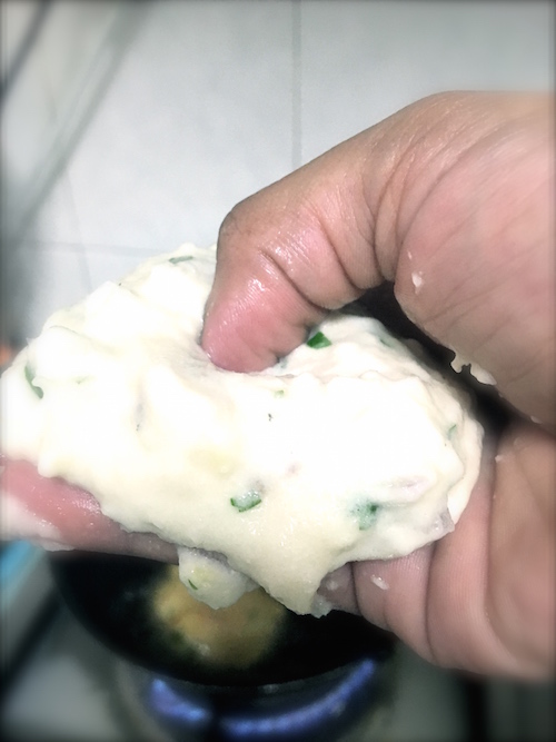 - Wetting the hands in the bowl of water prevents the batter from sticking to your hand. However once you scoop up the batter, do not mix it with your hands, simply make the hole with your thumb and slide into oil.